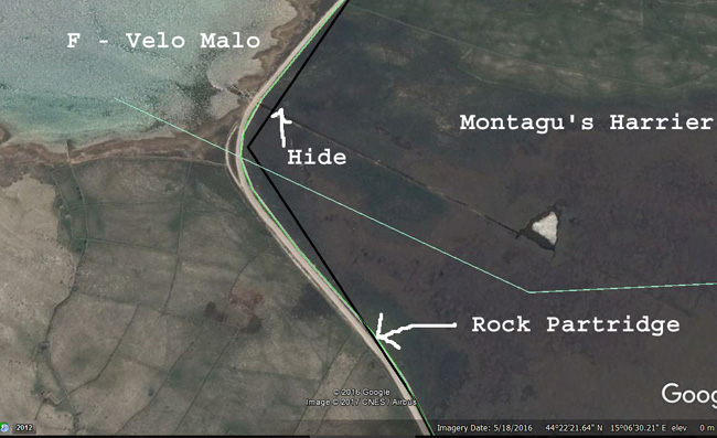 As I approached Velo Malo I could see several Montagu's Harriers over the reeds, including some fancy Sky Dancing. There were at least 9 pairs, plus a few singles. I watched them for a short while then headed off to Velo Blato for "round 2". I had only gone a few hundred yards when something made me turn my head. Luckily there was no other traffic because I almost crashed as I laid eyes on a very smart Rock Partridge sitting unconcerned on the roadside wall. I never expected to get this close.